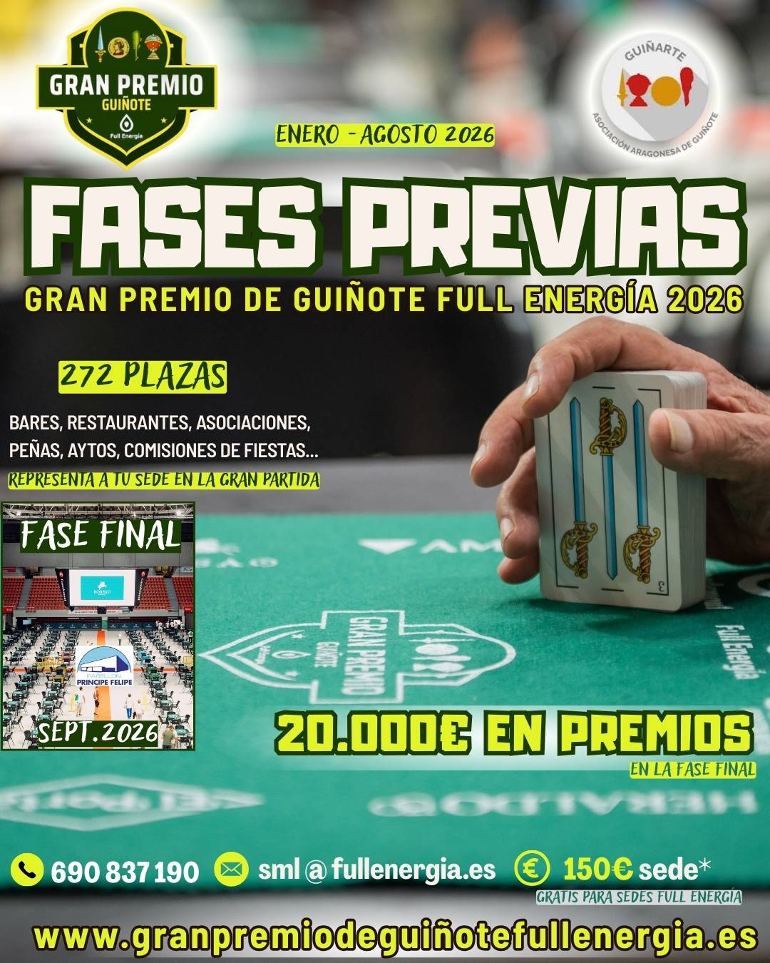 Además, si quieres jugar, vamos a organizar, junto a la ASOCIACIÓN ARAGONESA DE GUIÑOTE, varias Fases Previas en sitios estratégicos para que NADIE que quiera jugar, se quede sin poder participar. Lo iremos publicando cuando arranquemos.